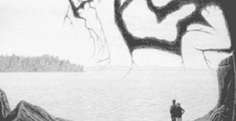Vidíte ty nožičky tvořené kmenem stromu? Celý obraz je miminko. Většina lidí se zaměří na detaily a třetí osoba zabírající praktický celý prostor jim unikne. Řešení podobných hádanek vyžaduje opravdu velkou všímavost a také schopnost podívat se na věci z různých úhlů.