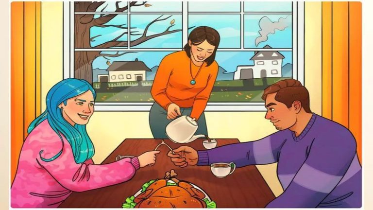 Na obrázku můžete vidět obvyklou rodinnou scénu. Zřejmě večeře, kdy se u stolu sešly 2 ženy a 1 muž. Možná rodina, rodiče a dcera, popřípadě návštěva. Na stole je pečený krocan a jedna z žen nalévá čaj. Na první pohled se na ilustraci neděje nic neobvyklého, zdání ovšem klame. Je zde jedna nesrovnalost, drobná chyba, kterou právě vy musíte najít. Pokud se vám to povede, budete jen jedni z mála lidí, kterým se to podaří.
