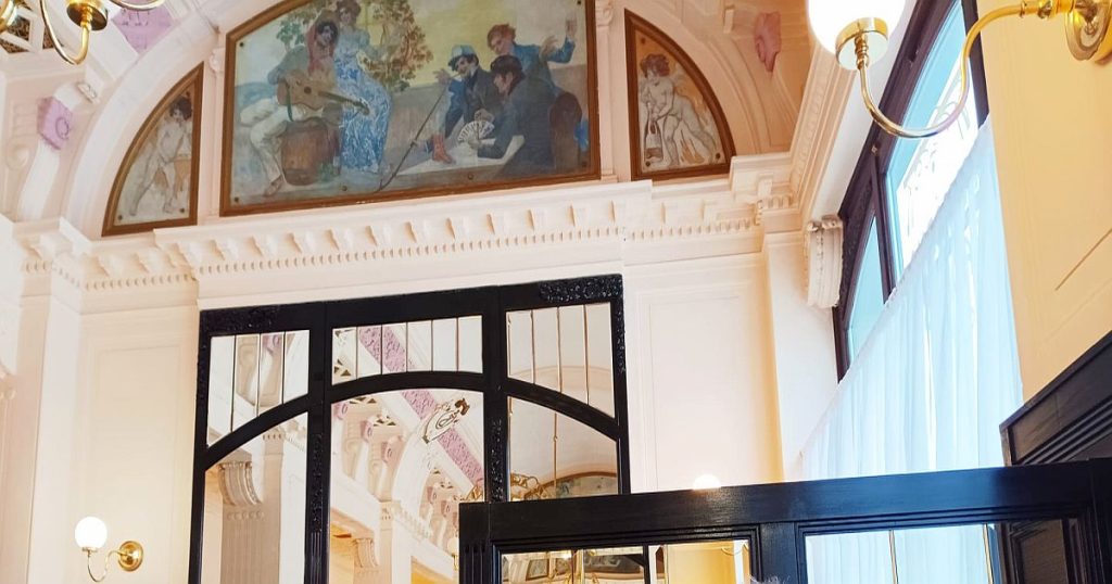 Dům, ve kterém se kavárna nachází, působí zvenčí nenápadně a klidně, takže pokud nevíte, kde hledat, nejspíš byste tenhle skvost doslova obešli obloukem. A to opravdu velkým. Jakmile ale vejdete dovnitř, získáte pocit, že jste se ocitli o sto let zpátky. Přivítají vás totiž nejen ony zmiňované vysoké stropy, ale i jemné ornamenty, původní secesní detaily a vyvážené barvy celého prostoru – od použitého zařízení až po výmalbu. Všechno je autentické, přirozené a sladěné tak, aby prostor dýchal noblesou, nikoli okázalostí.