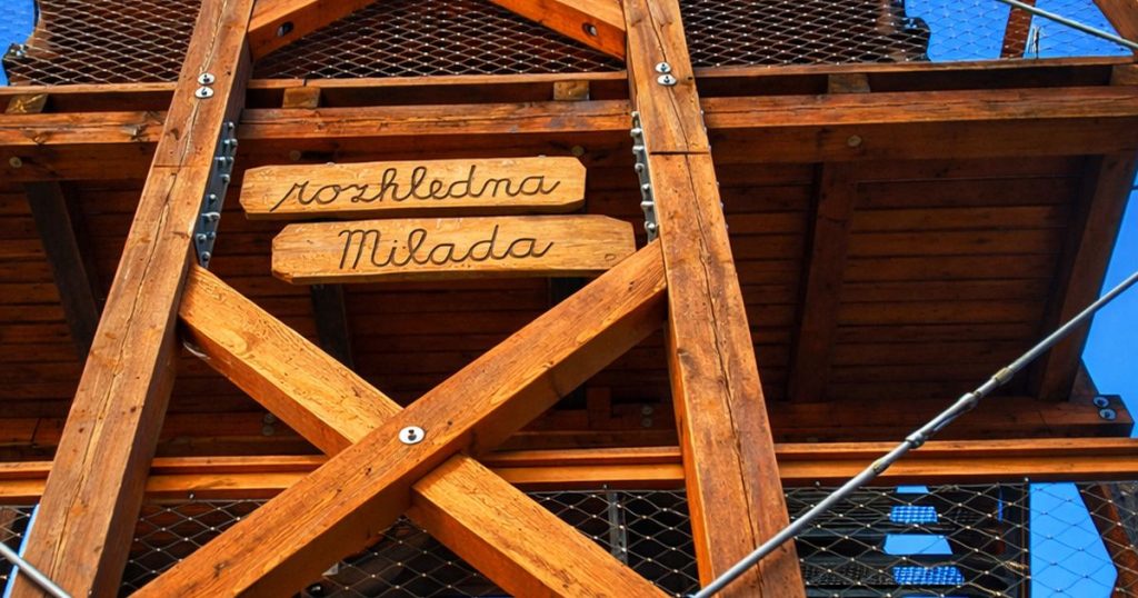 Rozhledna Milada je moderní konstrukce ze dřeva a oceli, která vcelku překvapivě prakticky vůbec nenarušuje okolní přírodu. Nepůsobí jako pěst na oko, spíš jako přirozená součást lesa, která se tu vyskytla tak nějak omylem. A právě to oceníte, když sem dorazíte mimo sezonu. Klid, vítr v korunách stromů a rozlehlá vodní plocha pod sebou.