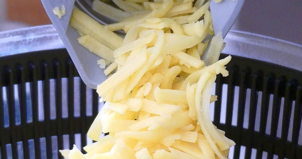 Brambory oloupejte, nahrubo nastrouhejte a zalijte studenou vodou. Po pěti minutách slijte a vše ještě jednou zopakujte. Vypadá to pracně, ale jde o nezbytný krok. Tím se totiž zbavíte veškerého přebytečného škrobu z povrchu brambor a placky pak budou krásně křupavé.